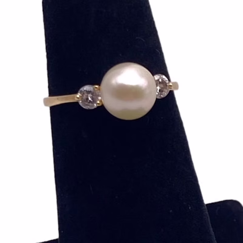 14K Gold Pearl Ring with 2 Diamonds - Size 7 - B5840