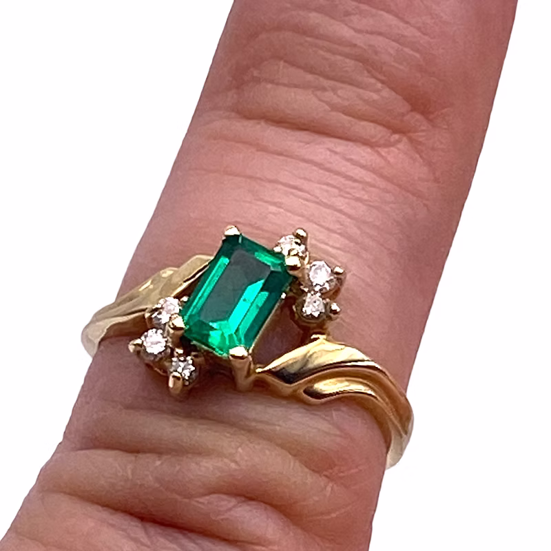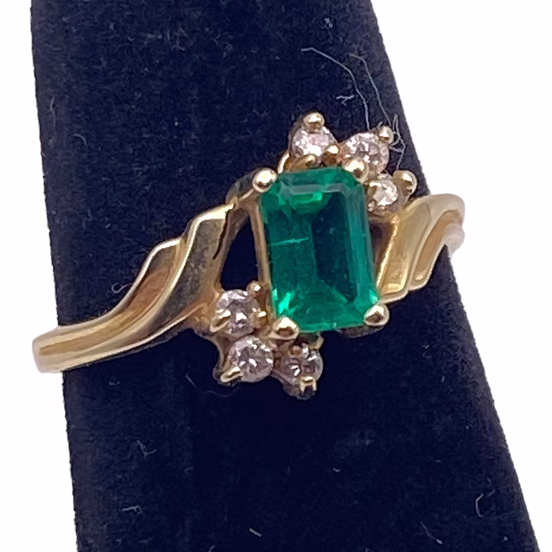 14K Gold Ring with Synthetic Emerald & 6 Diamonds - Size 5 - 2.3g - B5463